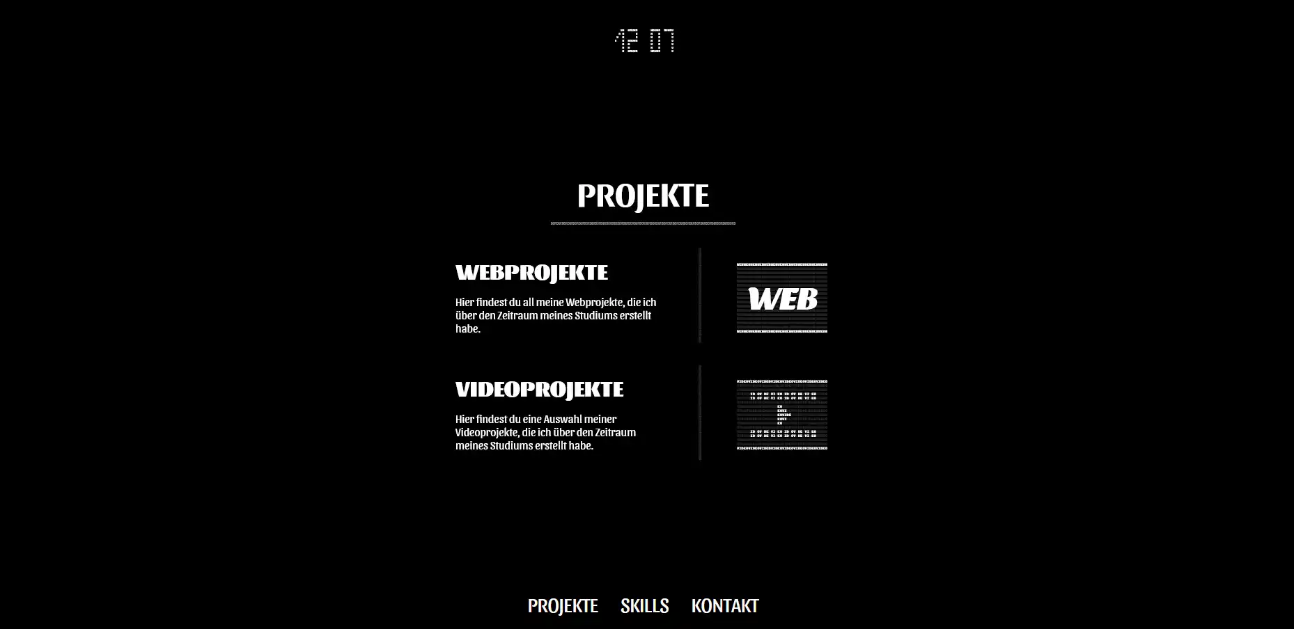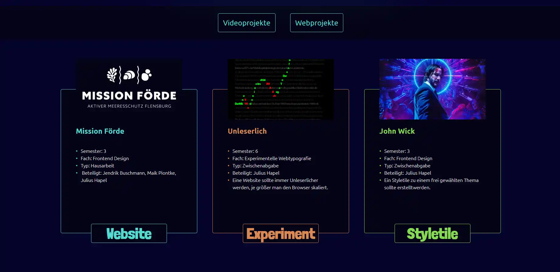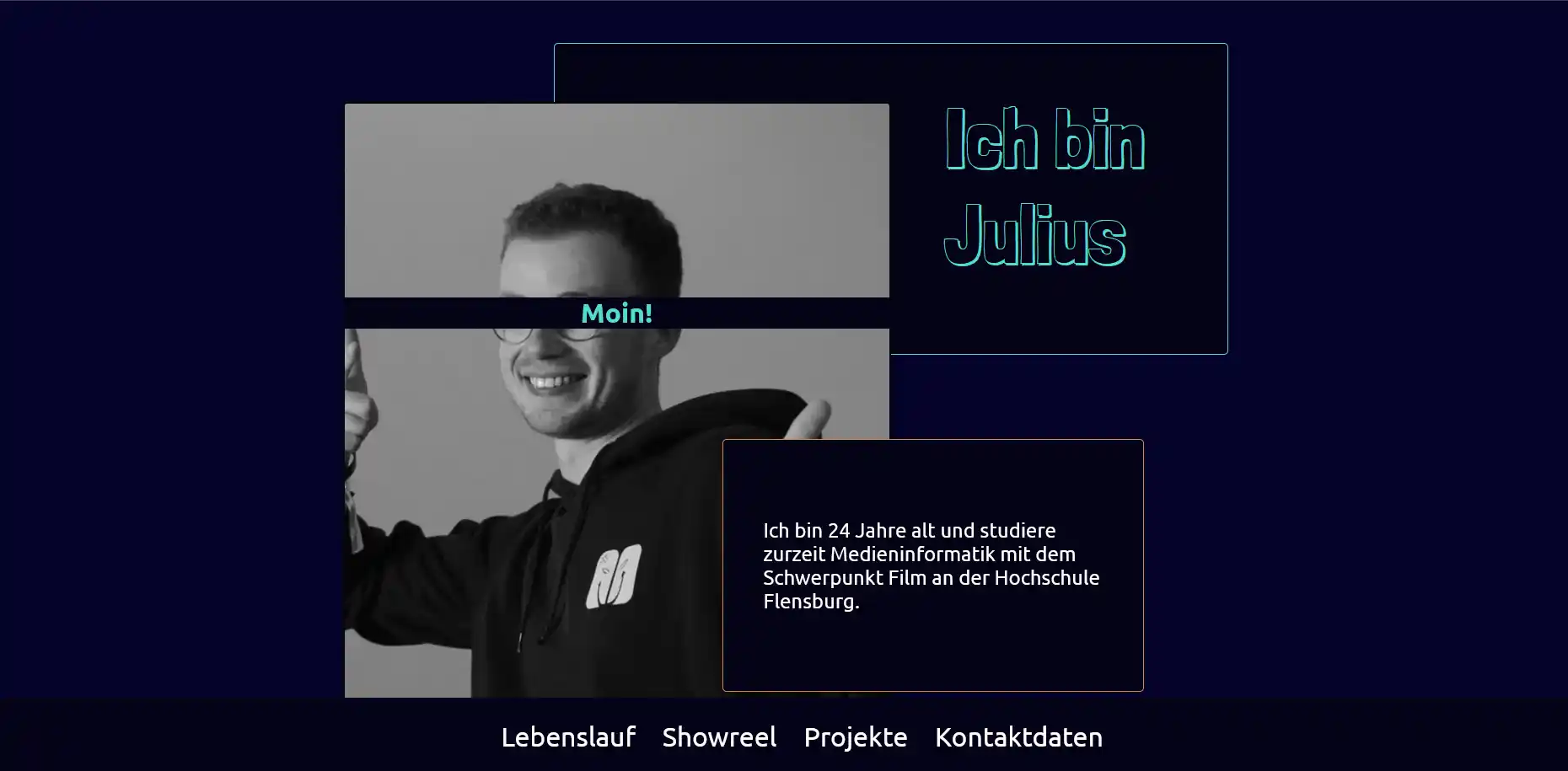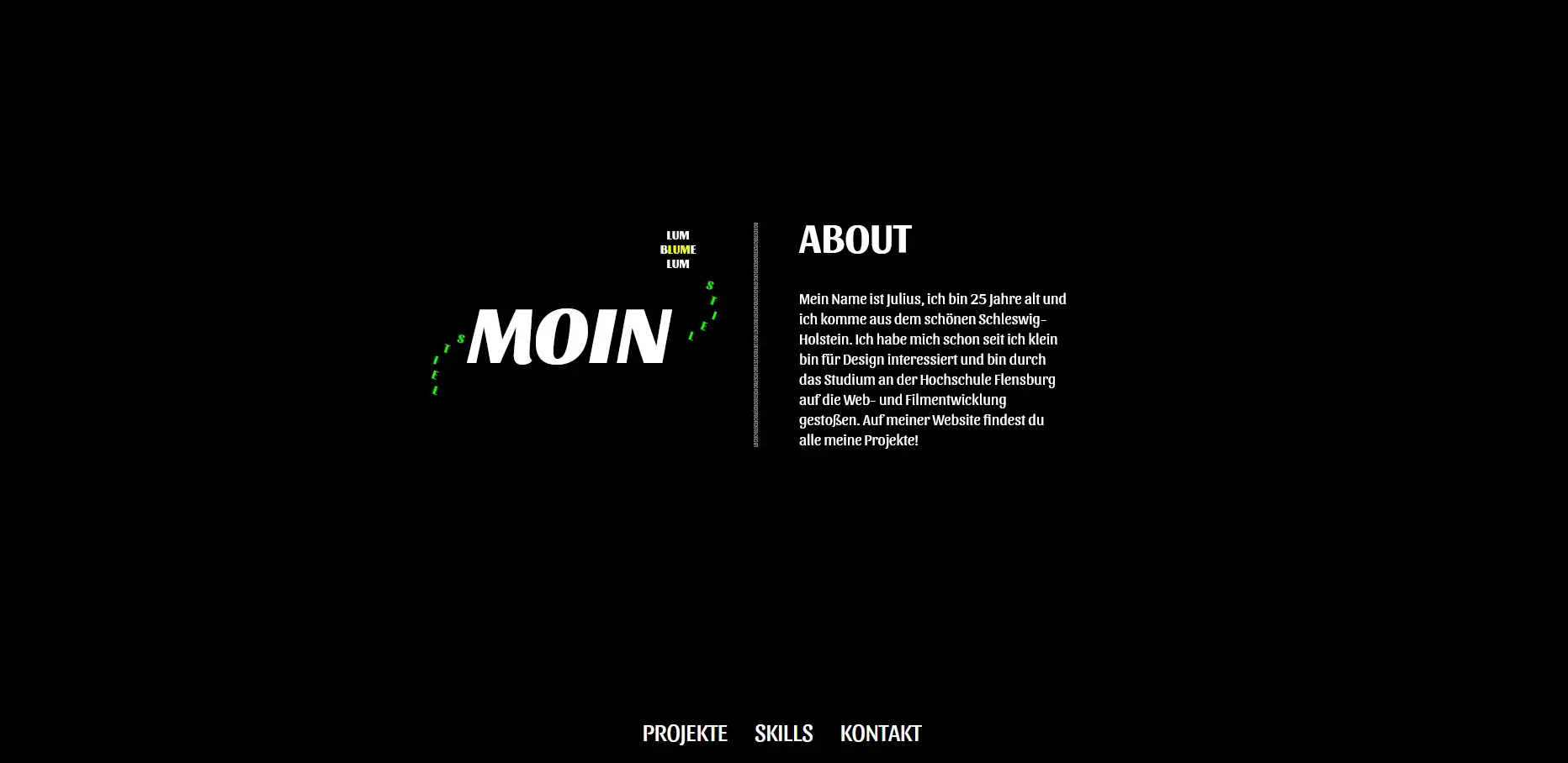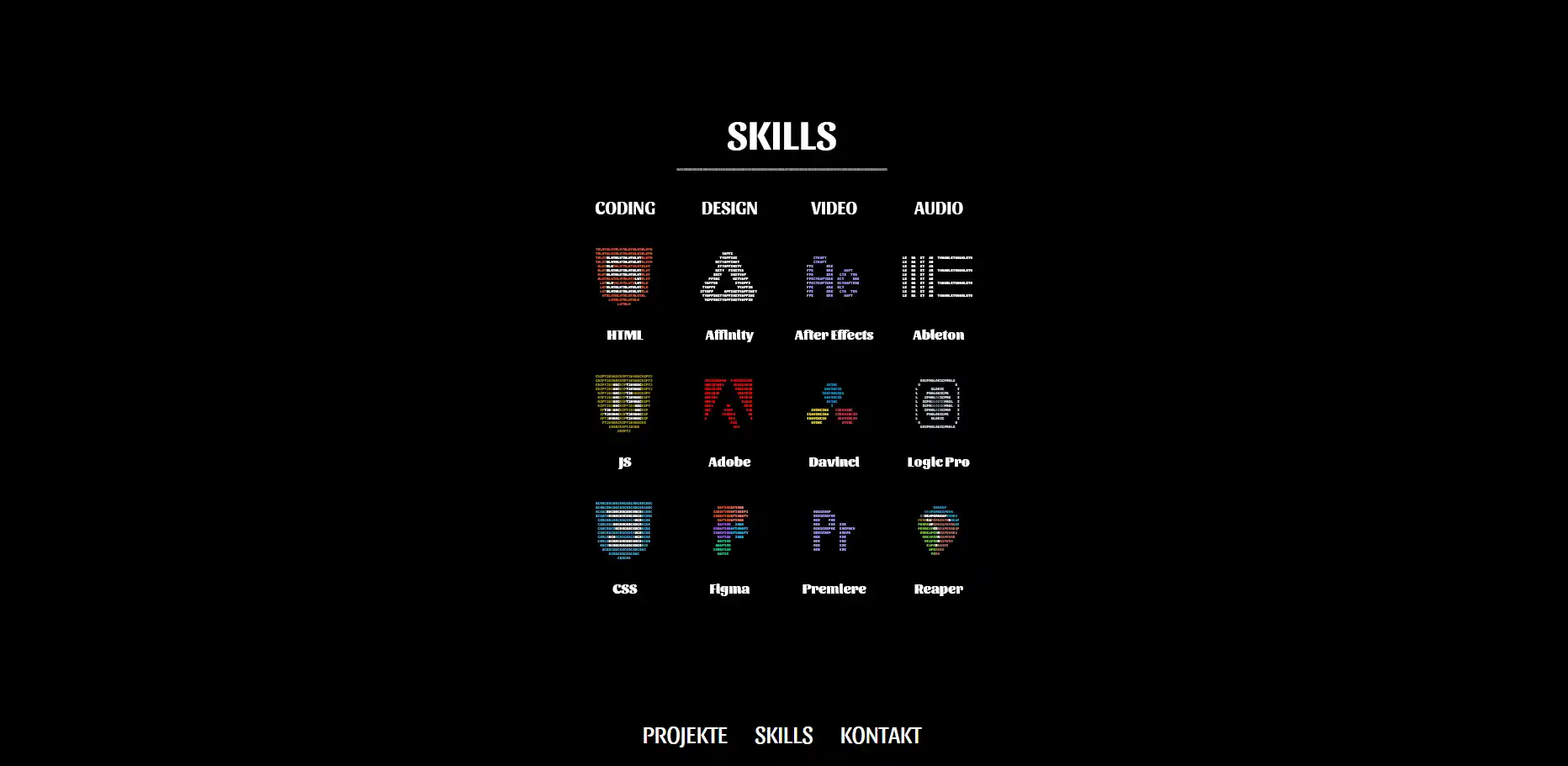 Das Portfolio aus dem Jahr 2024 ist für den Kurs Experimentelle Webtypographie entstanden. Es wurde eine Seite umgesetzt, bei der jedes Designelement aus dem eignen Wort besteht (z.B. Borders wurden aus dem Wort Border kreirt). Die Endbenotung für das Projekt belief sich auf eine 1,3.